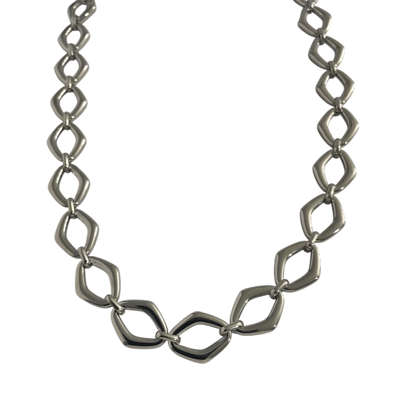 Collar en acero inoxidable presenta un diseño de cadena con eslabones en forma de rombos, aportando un toque moderno a cualquier look. Disponible en tono dorado y plateado, su acabado brillante lo convierte en el complemento perfecto para elevar desde un outfit casual hasta uno más elegante. Su diseño atemporal garantiza que nunca pase de moda.