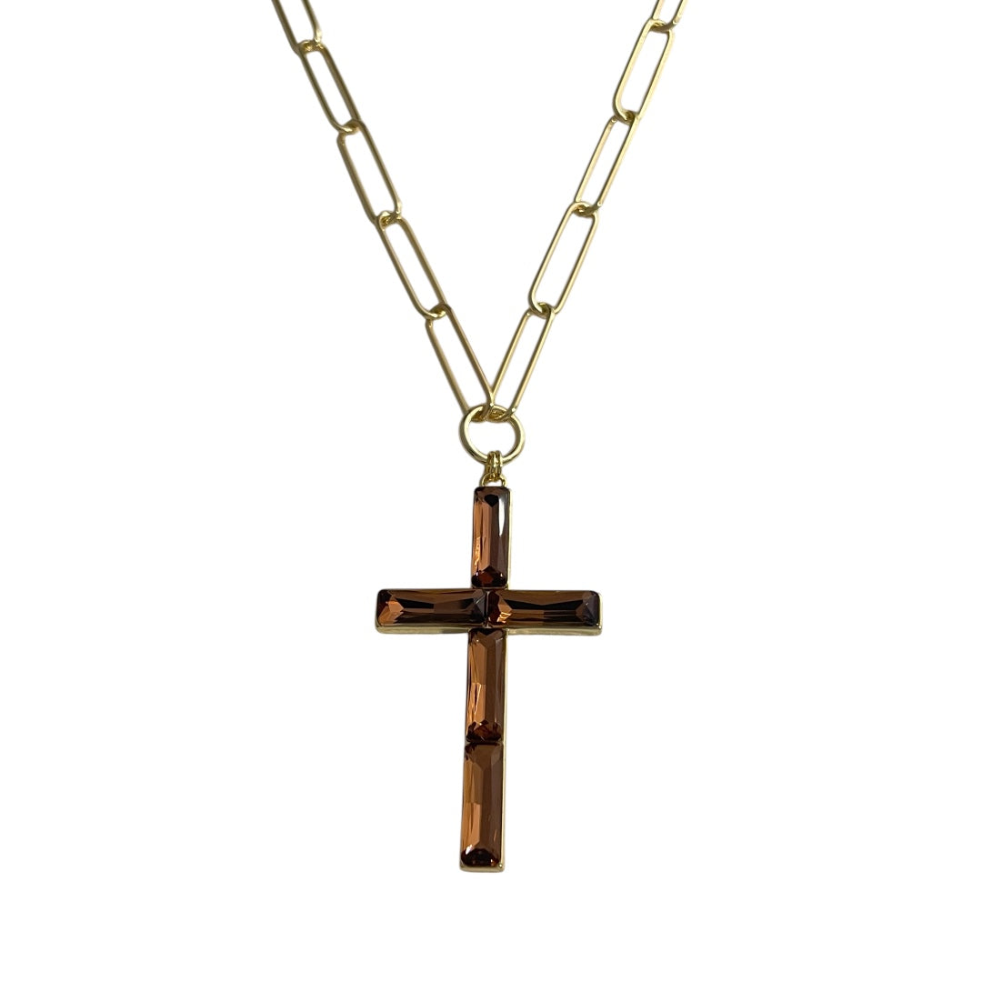 Un diseño elegante que combina una cruz de cristal en tono marrón junto a una cadena hipoalergénica de cobre bañada en oro de 18K. Su largo de 45 cm más 5 cm de alargo permite ajustarlo a tu estilo, convirtiéndolo en una pieza sofisticada para cualquier ocasión.