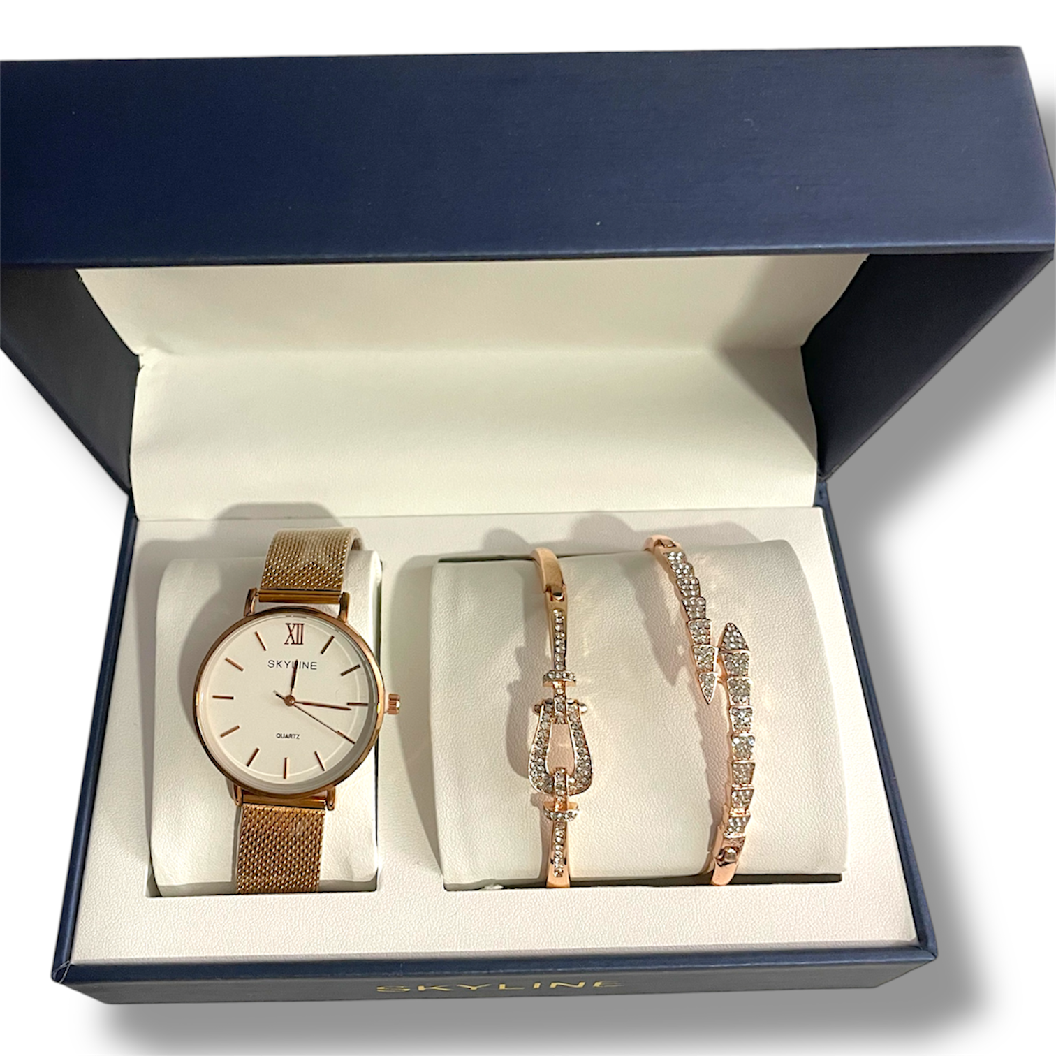 Reloj hipoalergénico de acero inoxidable, diseñado para quienes buscan estilo y comodidad en cada detalle. Incluye una pulsera a juego en rodio, creando una combinación moderna que realza cualquier look. Además, se presenta en un packaging premium exclusivo, pensado para proteger tus accesorios, ideal también para regalo.