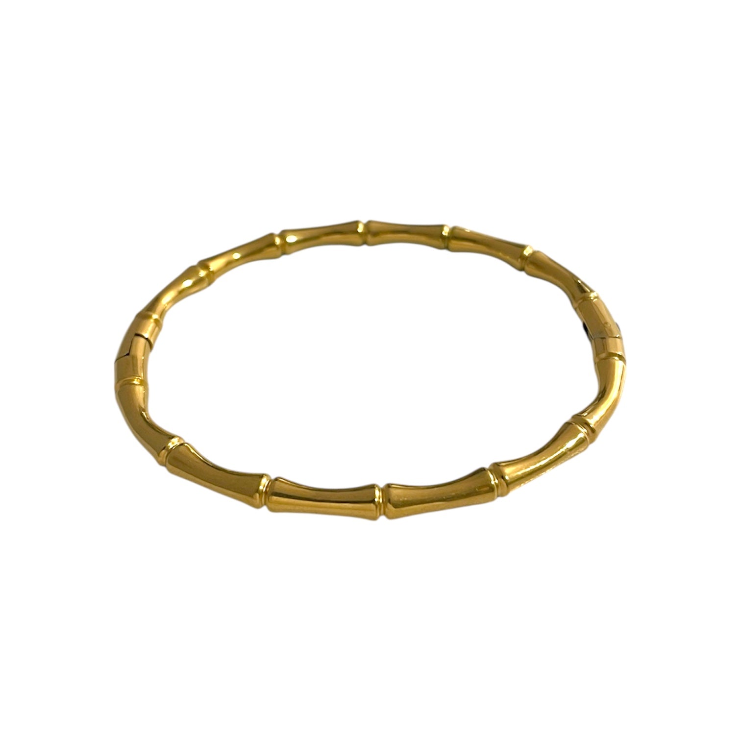 Está pulsera hipoalergénica está elaborada en acero inoxidable. Disponible en tono dorado, su diseño destaca por su forma de bambú. Su estilo atemporal lo convierte en el complemento ideal para realzar tanto looks casuales como elegantes.